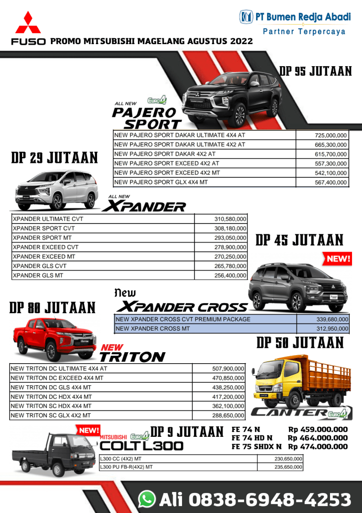 Daftar harga OTR Mobil Mitsubishi Magelang tidak mengikat, sewaktu-waktu dapat berubah tanpa pemberitahuan terlebih dahulu.